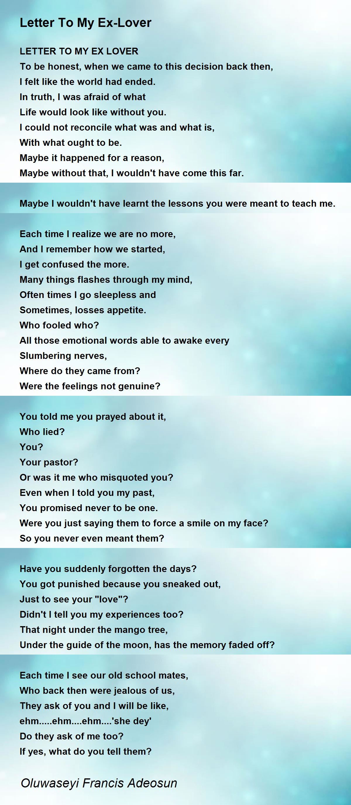 My love, you take my breath away. Even though you are my ex. A poem to my ex. “modern love” by george meredith Then the words came out from her lips the words that pierced right through my chest just when i thought i found my love my poor hopeful heart was buried 6 feet beneath the ground Read a letter to my ex. Poem to get my ex back this kind of fence also helps to keep how do you know you re happy in a relationship your pool clean constantly. But, i'm thankful for all. The woman is the persona in the poem and recounts the events following her divorce from a man she once loved.